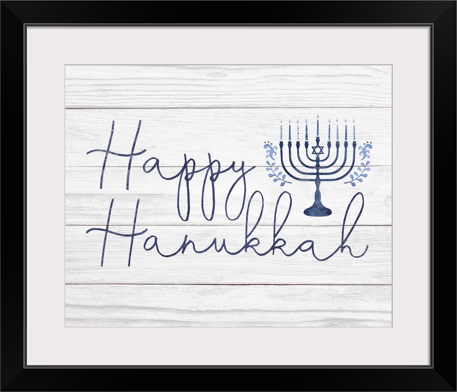 <p>Happy Hanukkah in a hand-written script and blue menorah on a distressed barnwood background.</p>