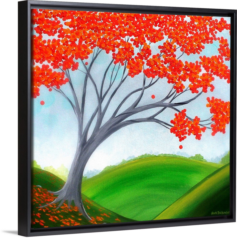 <p>Contemporary square painting of a tree with red leaves on the side of a hill with rolling hills in the background.</p>