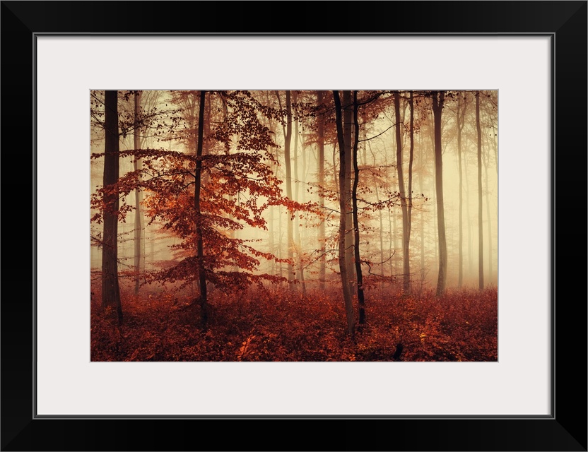 <p>Fine art photo of a misty forest of slender trees in fall colors.</p>