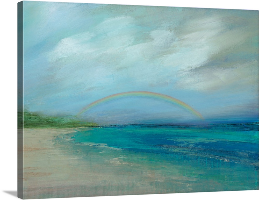<p>A serene, painterly coastal scene featuring a vibrant rainbow arching over turquoise waters and a sandy beach under a soft, cloudy sky.</p>
