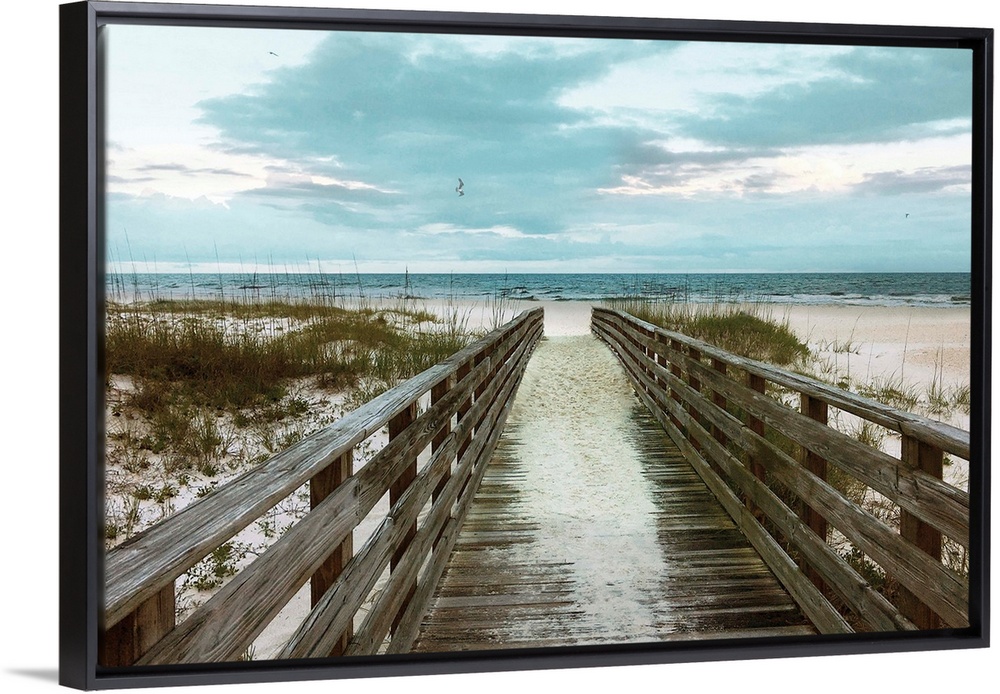 <p>A photo of a boardwalk leading to a sandy unoccupied beach.</p>