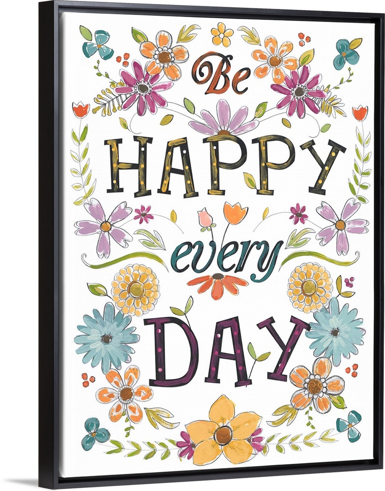 <p>Bright, happy typographical art with floral elements. "Be Happy Every Day."</p>