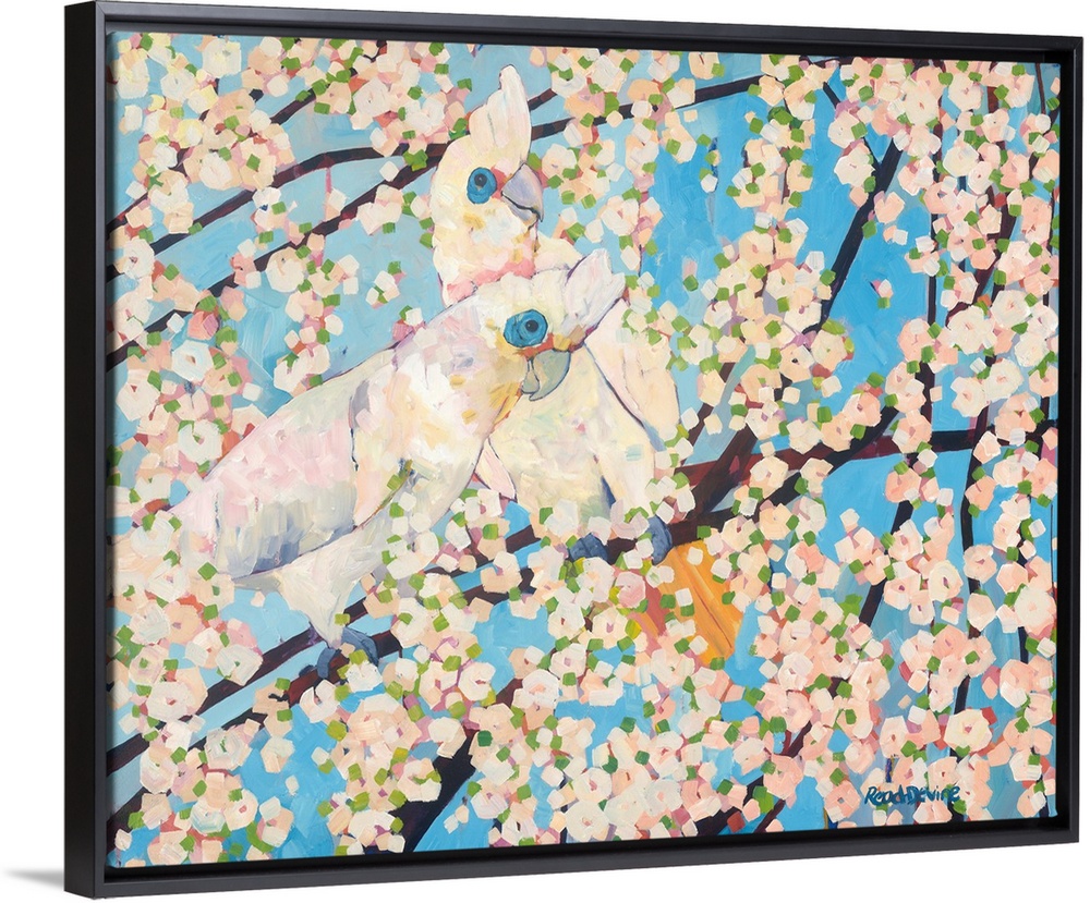 <p>Impressionist painting of two white cockatoos sitting in a tree with white blossom and a background of blue sky.</p>