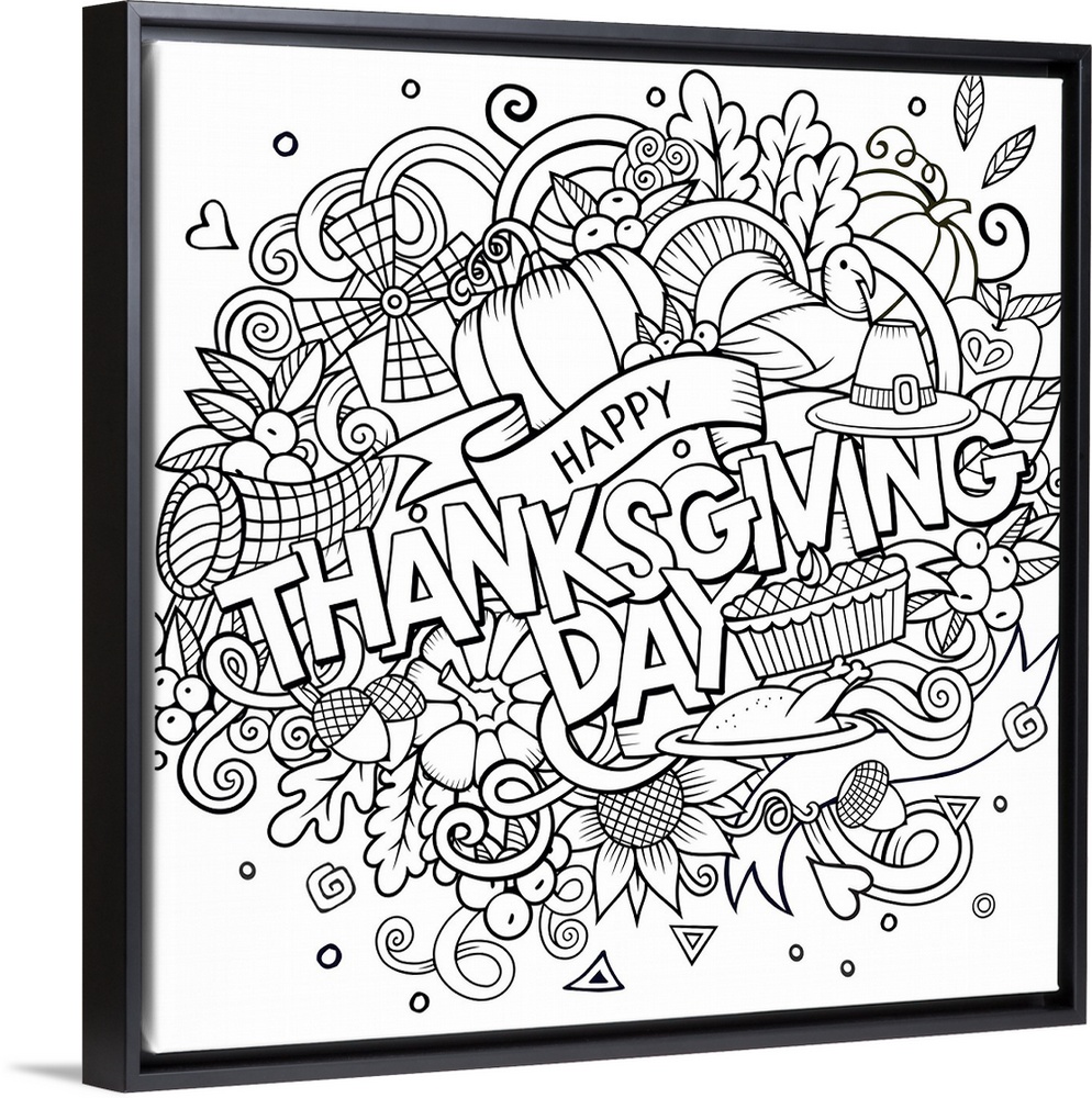 <p>A series of Thanksgiving and harvest-themed objects, such as pumpkins, leaves, and turkeys, surrounding the words "Happy Thanksgiving Day."</p>