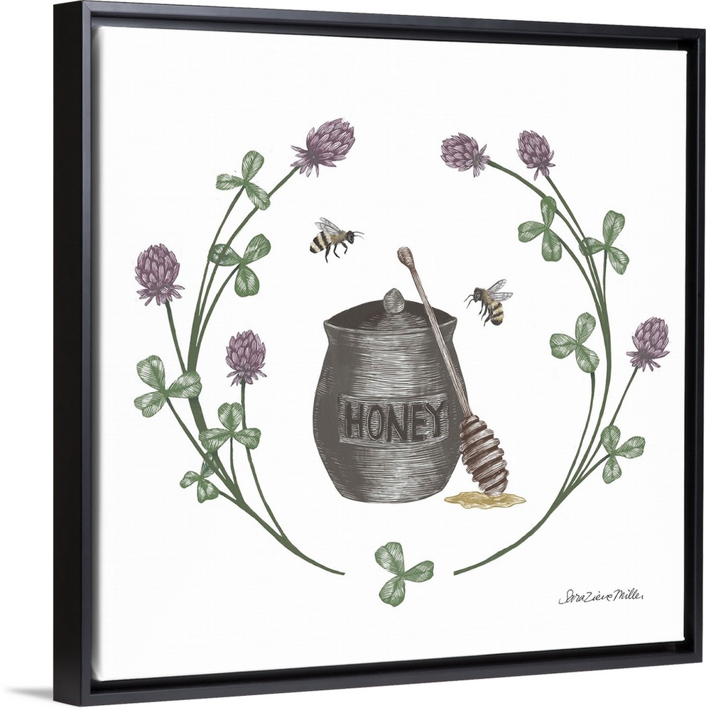 <p>Square illustration of a jar of honey with bumblebees framed with a wreath of flowers.</p>