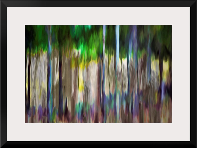 <p>Abstract image of a group of trees and flowers in Summer. The light was bright and brought out all sorts of colors in both the tree trunks and the foreground flowers. The foliage shows bright to dark green. The image was made using the vertical ICM (Intentional Camera Movement) technique. The purpose is to give an impression of the joy of Summer, with all its bright, beautiful colors.</p>