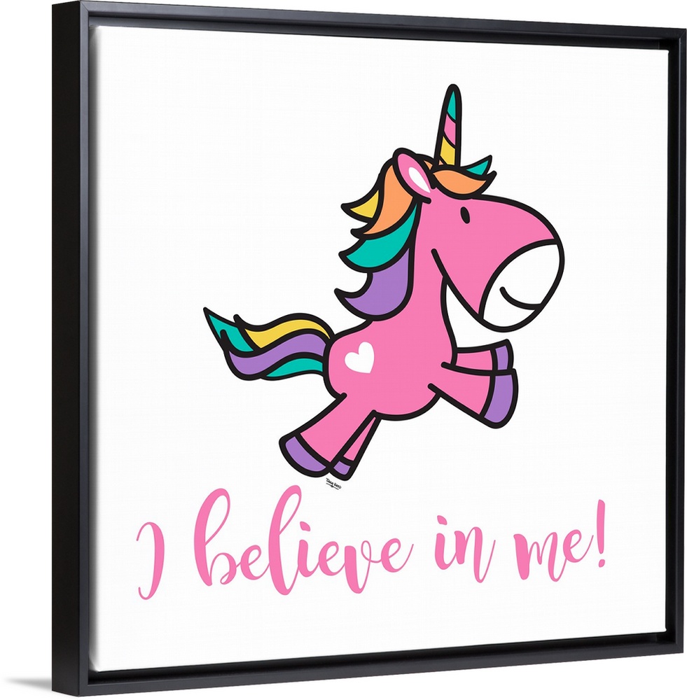 <p>Adorable decorative illustration of a pink unicorn with rainbow hair and "I believe in me!"</p>