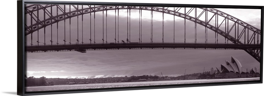 <p>Panoramic photo on canvas of a long bridge over water in Sydney with the Opera House in the lower right.</p>