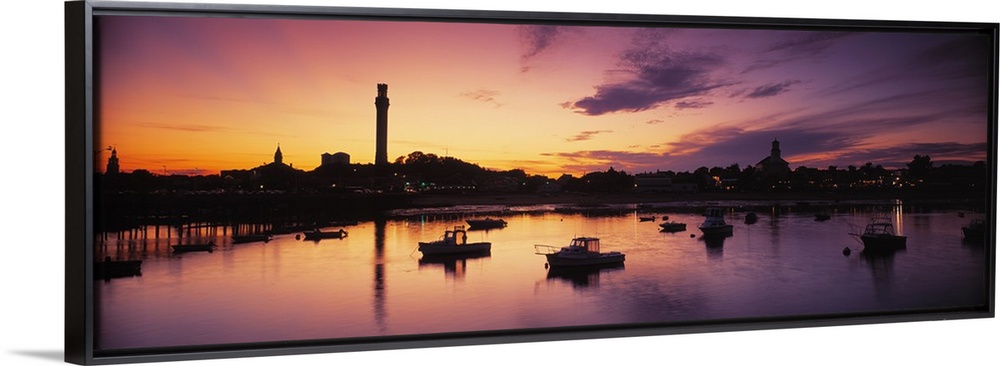 <p>Oversized photograph of the sun setting on the horizon as many boats in a harbor are silhouetted in Cape Cod, Massachusetts.</p>
