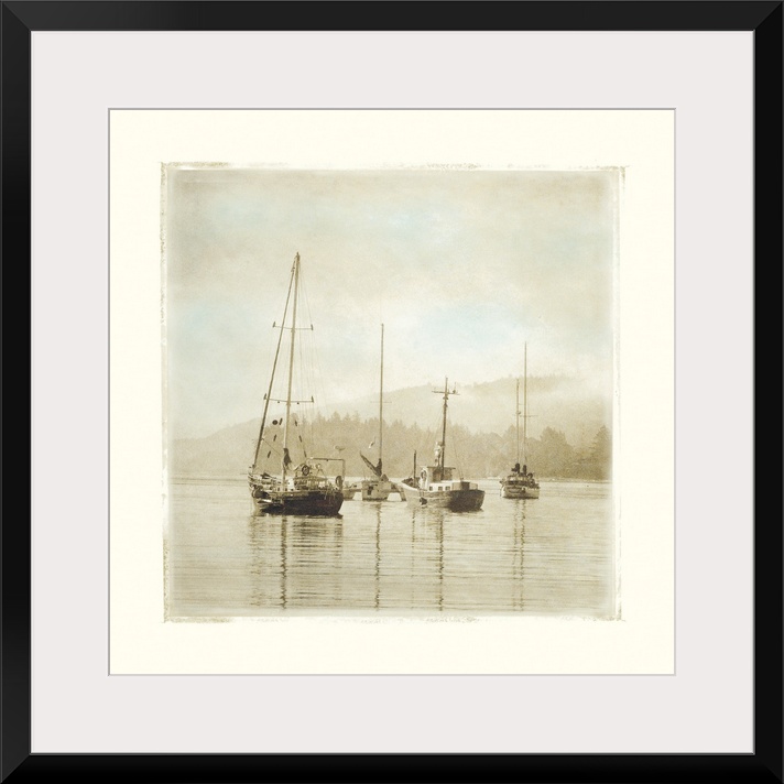 <p>Painting of sailboats sitting calmly in the harbor waters.</p>