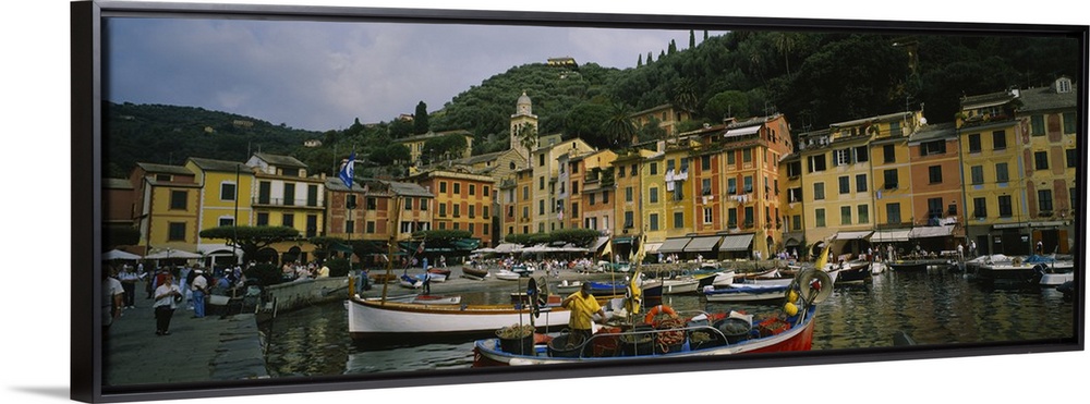 <p>Panoramic canvas of an Italian boat harbor with a bunch of boats and buildings meeting the water in the background.</p>