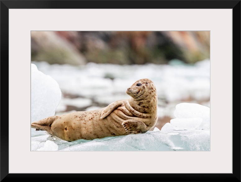 <p>Harbor seal (Phoca vitulina) hauled out on ice calved from South Sawyer Glacier, Southeast Alaska, United States of America, North America</p>