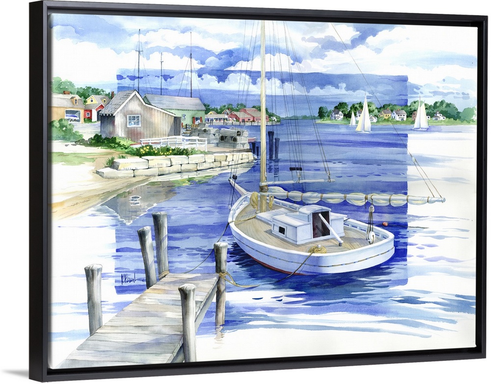 <p>Watercolor painting of a harbor with boats, a wooden pier, and coastal homes.</p>