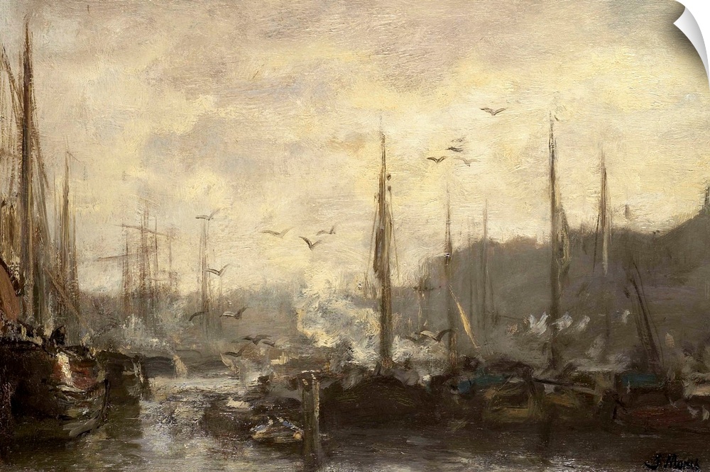 <p>Harbor View, by Jacob Maris, c. 1887, Dutch painting, oil on canvas. Gulls fly over the masts of moored boats.</p>