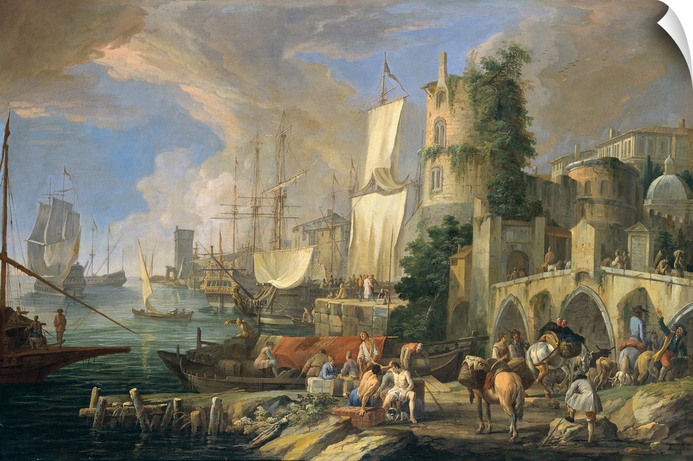 <p>Harbor's View with Bridge and Tower (Veduta di porto con ponte e torre), by Luca Carlevaris, 1713, 18th Century, oil on canvas, Italy, Lombardy, Milan, Credito Artigiano. Whole artwork view. The painting representes a scene of everyday life in a harbour, enlivened by male figures deep in their work or having a conversation; in the lower part, two men half-naked are discussing one, Luca Carlevaris, Harbor's View with Bridge and Tower (Veduta di porto con ponte e torre), XVIII d.C., Oil on canvas,</p>