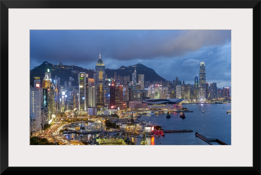 <p>Elevated view, Harbour and Central district of Hong Kong Island and Victoria Peak, Hong Kong, China</p>