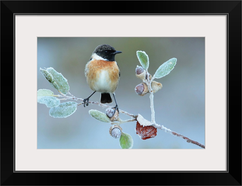 <p>A European Stonechat perched on a frozen twig with acorns.</p>