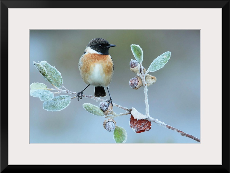 <p>A European Stonechat perched on a frozen twig with acorns.</p>