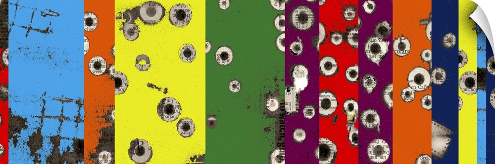 <p>An abstract piece of artwork with various color blocks running vertically through the panoramic print. Different shapes are created in each color block.</p>