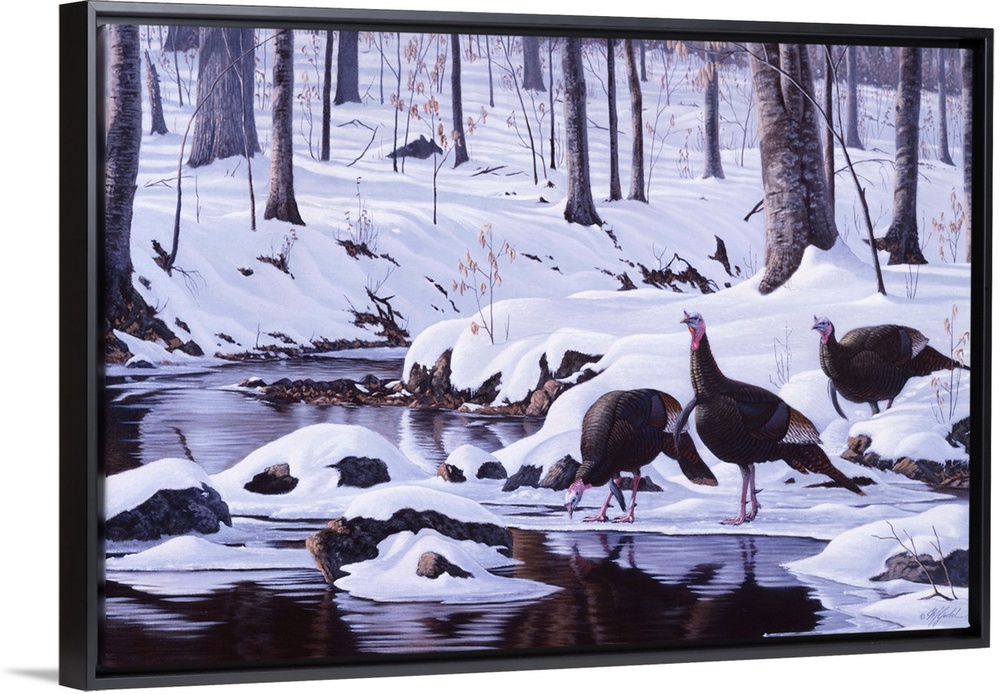 <p>Wild turkeys drinking at a forest stream after a heavy snowfall.</p>