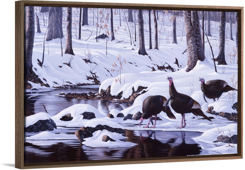 <p>Wild turkeys drinking at a forest stream after a heavy snowfall.</p>