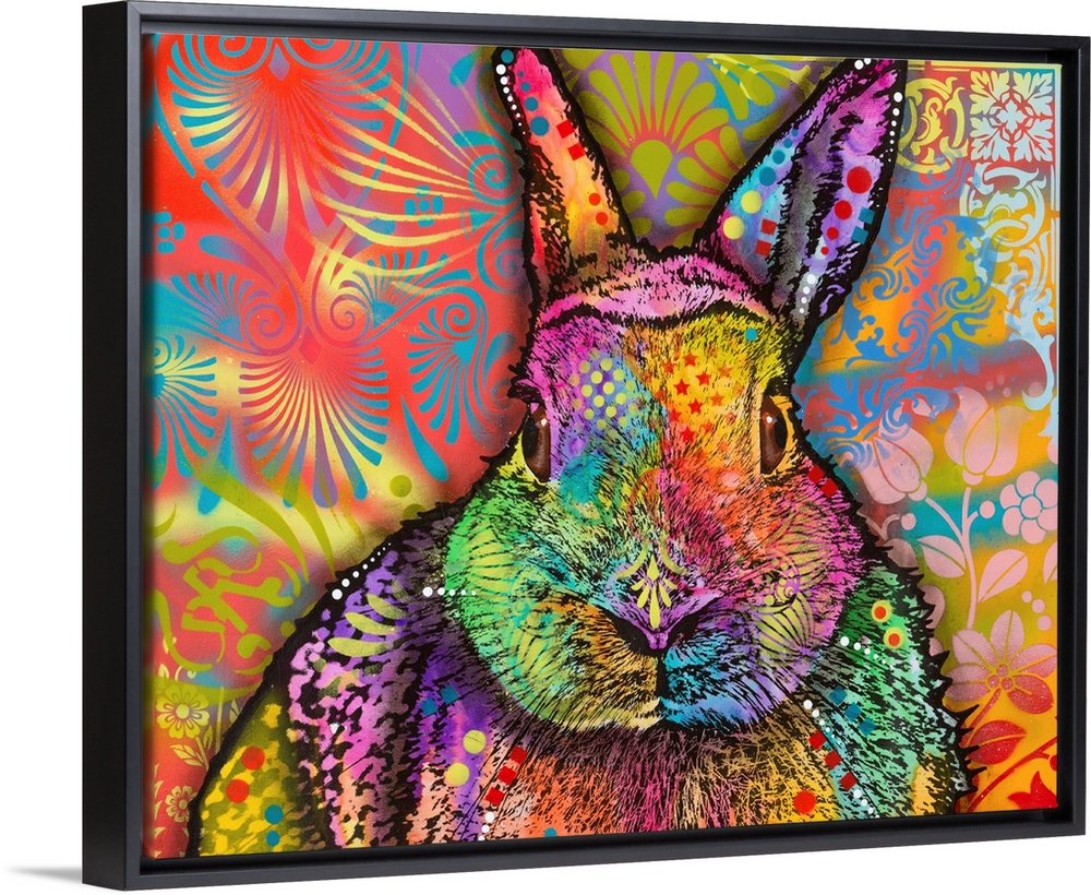 <p>Very colorful painting of a rabbit with abstract and floral designs all over.</p>