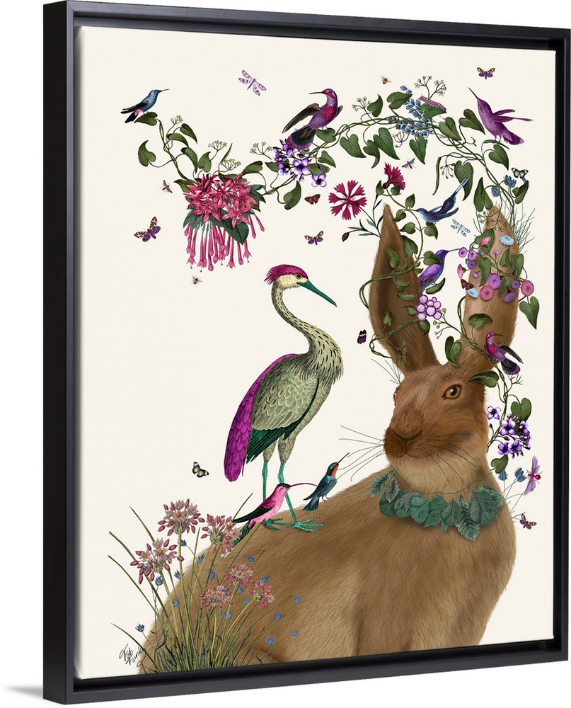 <p>Digital illustration of a rabbit wearing leaves around his neck and on his ears and colorful birds.</p>