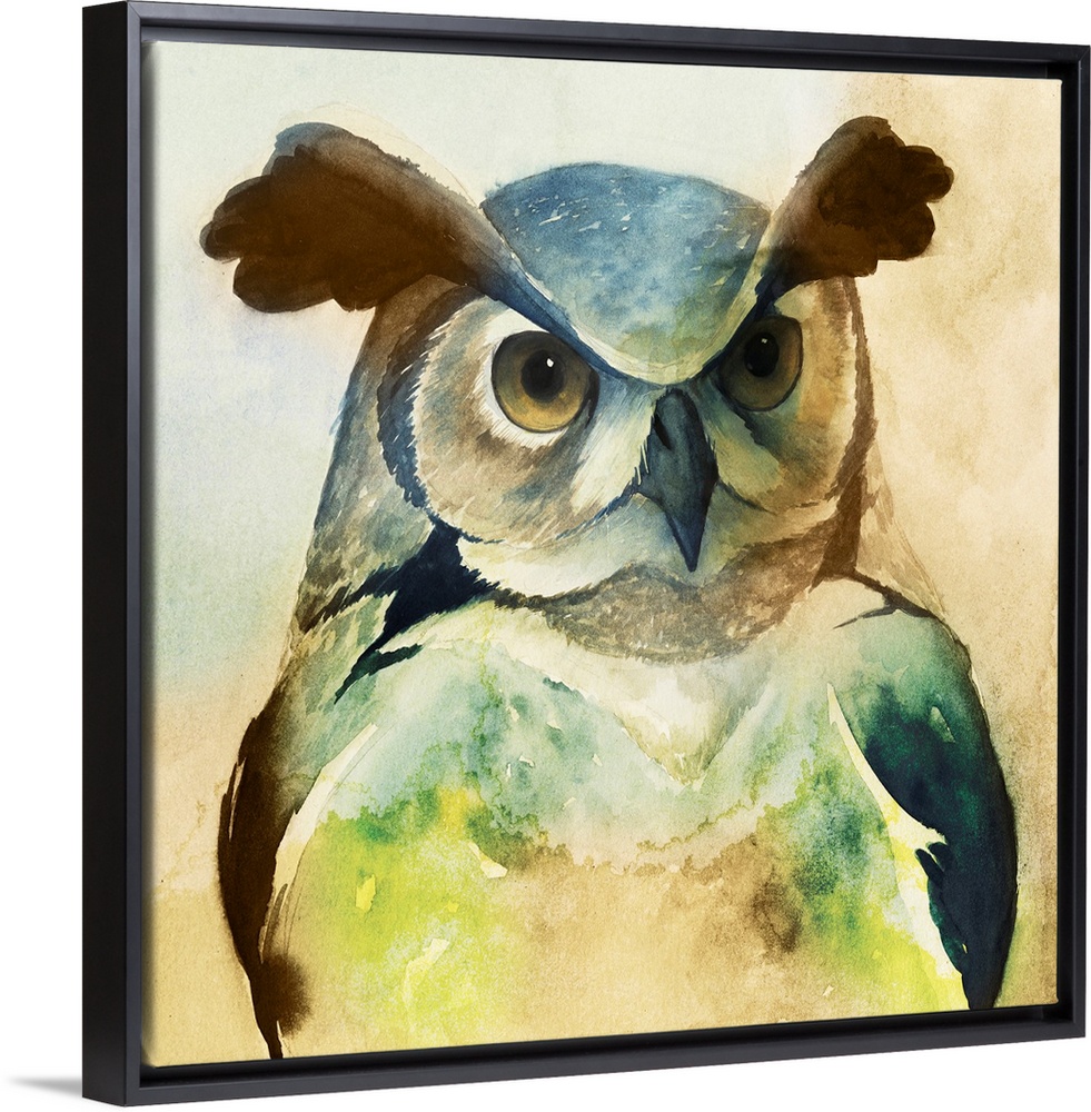 <p>Watercolor painting of an owl in pale and vibrant green tones.</p>