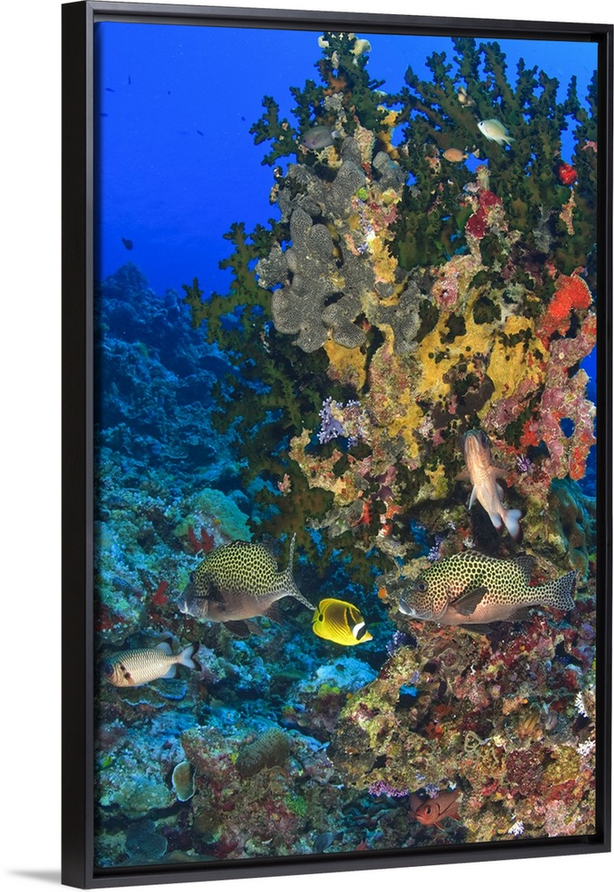 <p>Harlequin Sweetlips (Plectorhinchus chaetodoniodes), Butterflyfish, and Glasseye, Palau, Micronesia, Rock Islands, World Heritage Site, Western Pacific.</p>