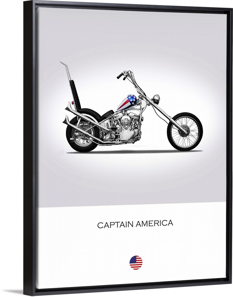 <p>Photograph of a Harley Davidson Captain America printed on a white and gray background.</p>