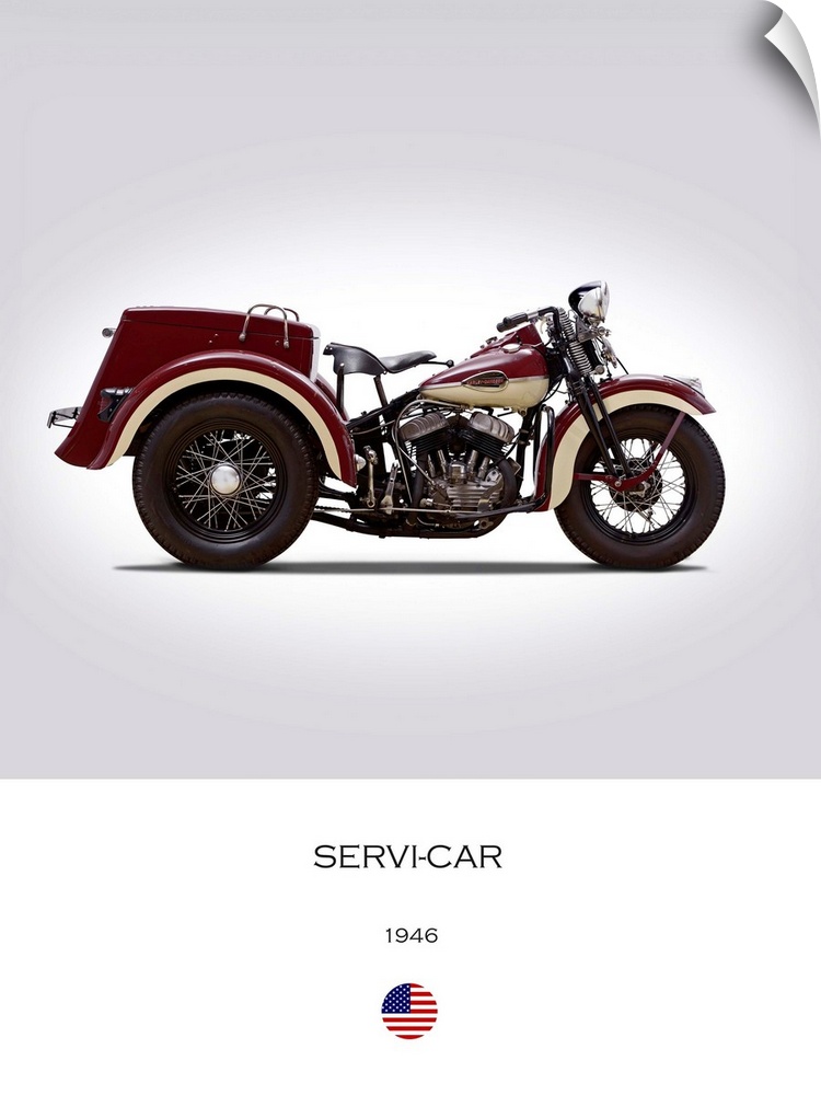 <p>Photograph of a Harley Davidson Servi Car 1946 printed on a white and gray background.</p>