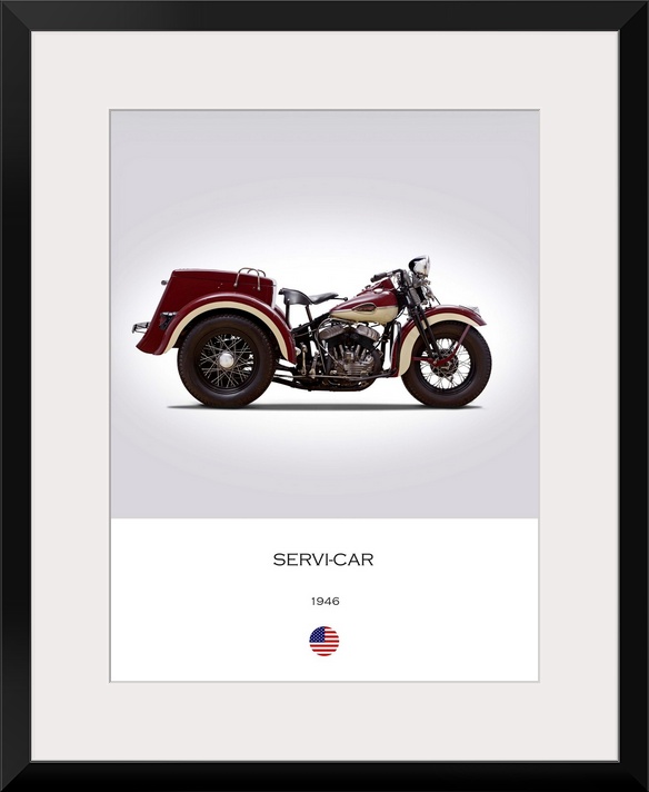 <p>Photograph of a Harley Davidson Servi Car 1946 printed on a white and gray background.</p>