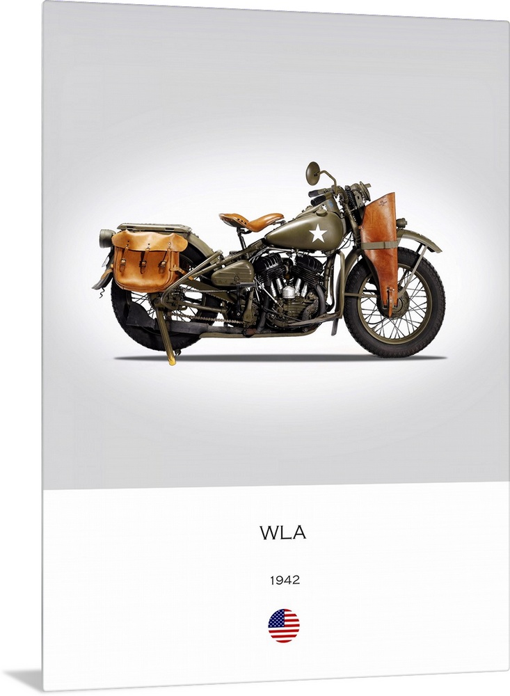 <p>Photograph of a Harley Davidson WLA 1942 printed on a white and gray background.</p>