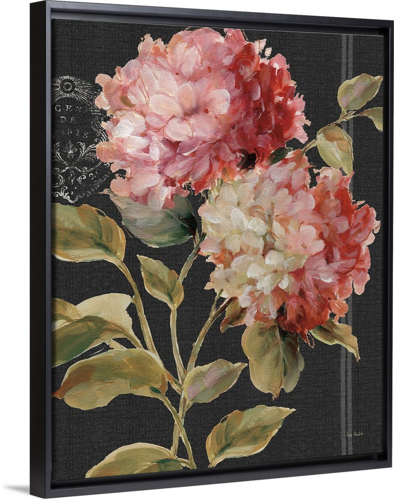 <p>Large painted pink hydrangea on a black background with a white design.</p>