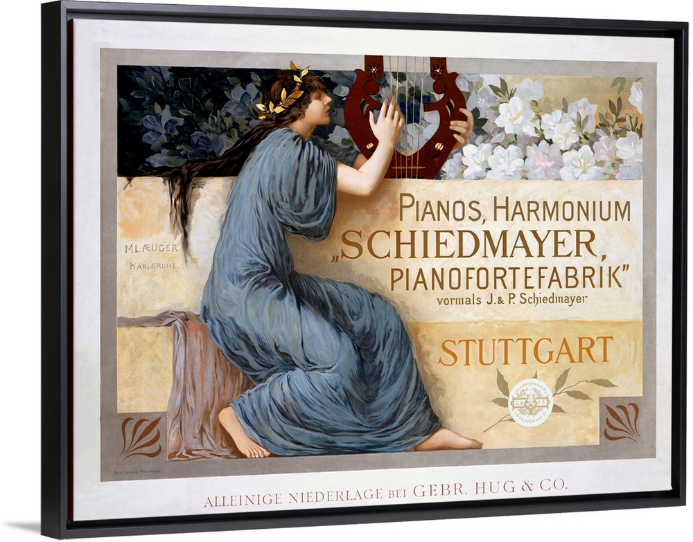 <p>Woman in blue gown sits on a bench playing a harp. There is a classicist feeling in this fine design, which makes us assume it's the Muse of Music we see here, Euterpe herself, singing the praises of piano manufacturer Schiedmayer. That would also fit with the personality of the designer, a clasically educated pedagog, writer and all-around artist of Karlsruhe: he studied graphic arts and architecture there, took up painting in Paris, and taught interior design and landscaping at the Karlsruhe Technical High School for many years.</p>