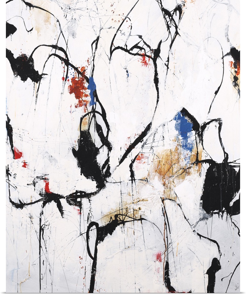 <p>Abstract artwork with bold, black lines and blotches of color on a white background with orange, red, and blue splatters.</p>