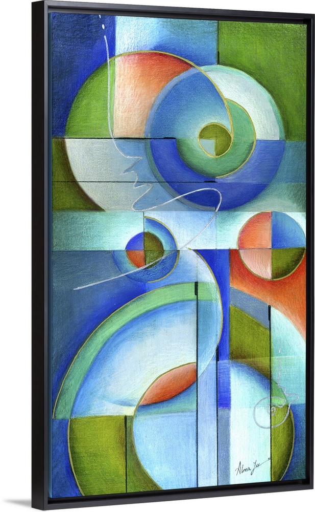<p>Vertical abstract painting of vibrant colored shapes in circles and triangles.</p>