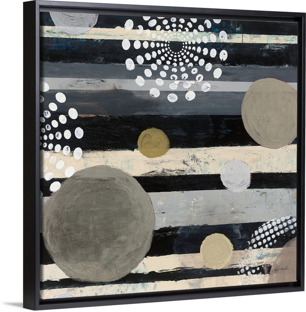 <p>Square abstract art with a striped background and different colored circles on top.</p>