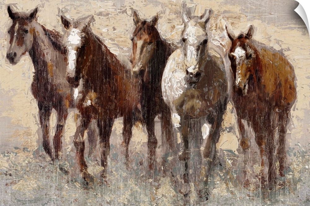 <p>Contemporary painting of a band of brown horses in a field.</p>