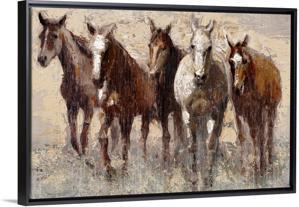<p>Contemporary painting of a band of brown horses in a field.</p>