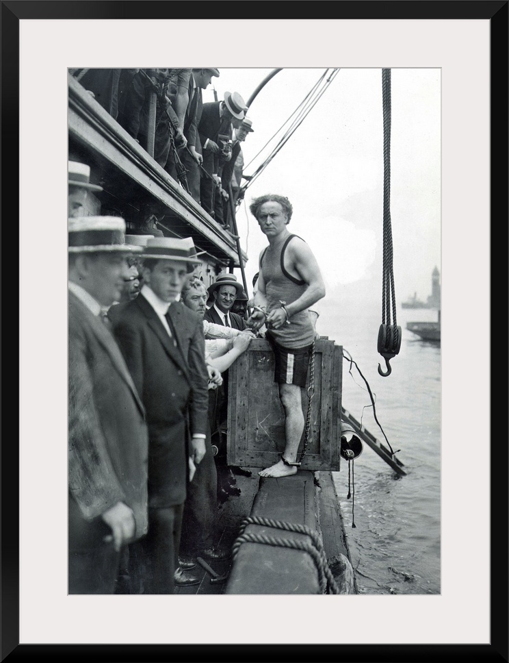 <p>American magician. A shackled Houdini about to be padlocked into a packing case and lowered into New York harbor, 1914.</p>