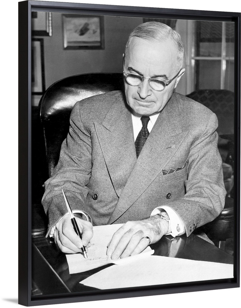 <p>President Harry Truman signing a document allowing American involvement in the Korean War, 1950.</p>