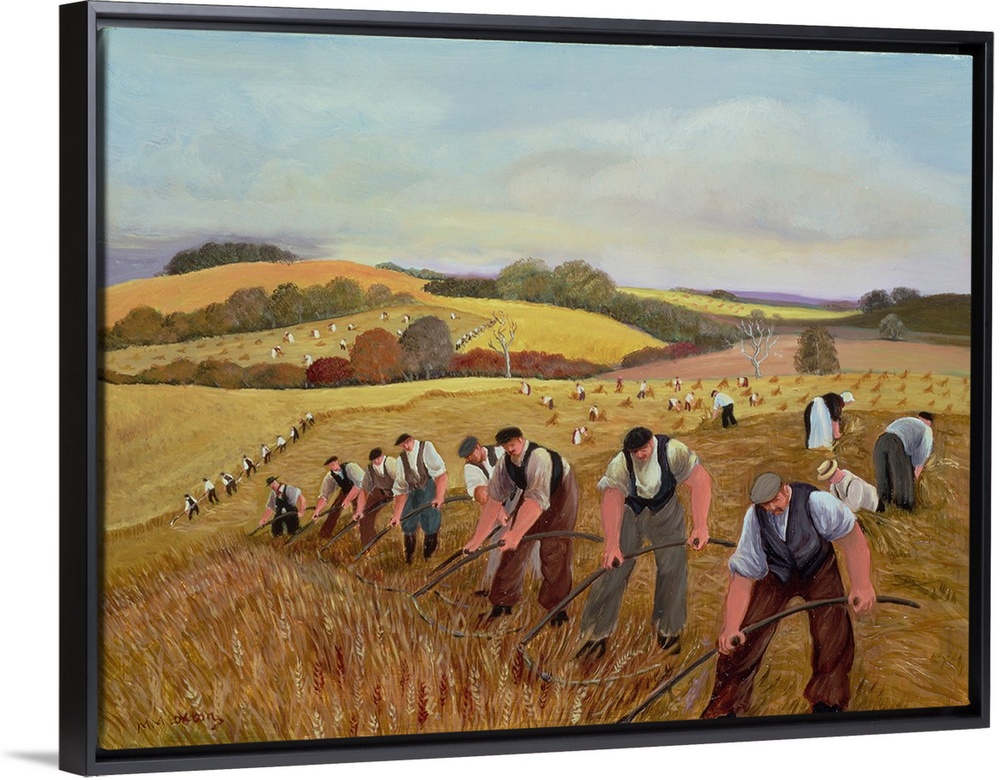 <p>Contemporary painting of several farmhands harvesting in a field.</p>