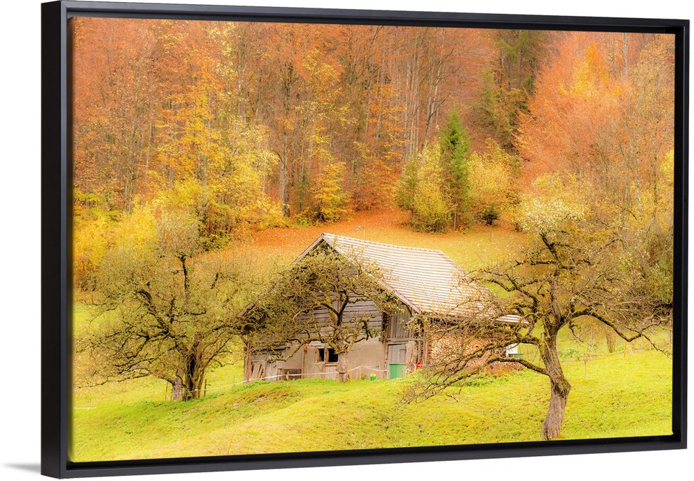 <p>Landscape photograph of an old barn on a hill surrounded by Autumn trees.</p>