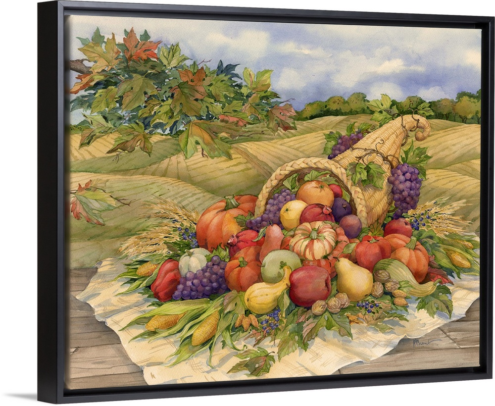 <p>Painting of a cornucopia filled with harvest vegetables in an autumn field.</p>