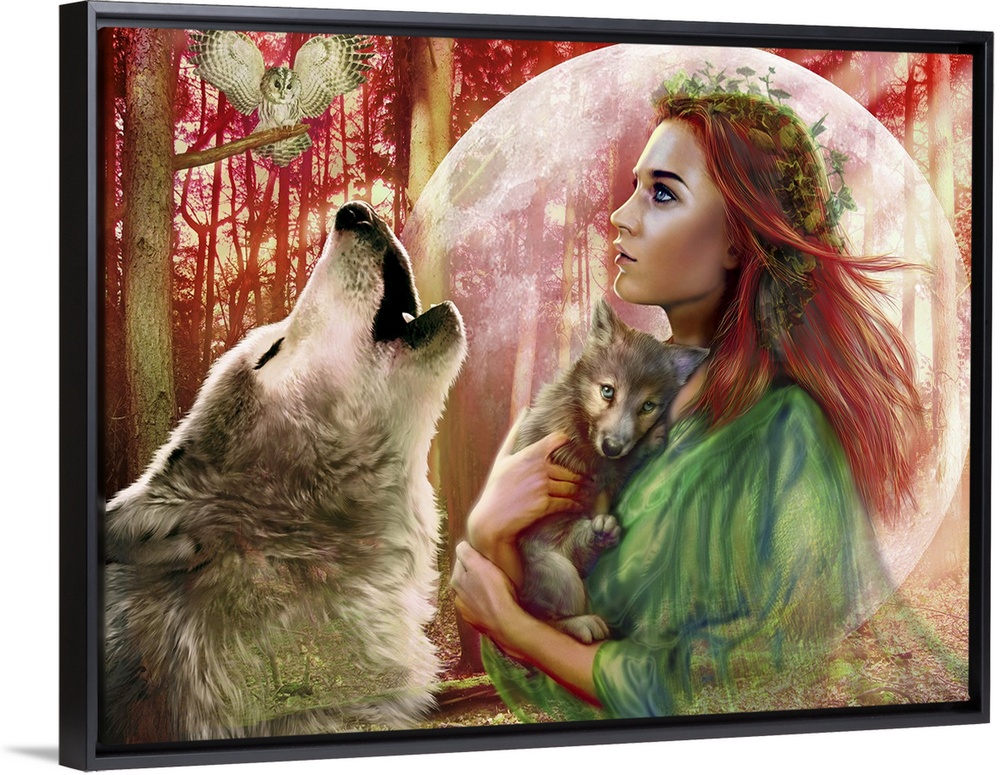 <p>Fantasy art work of a red haired woman with ivy in her hair in a forest holding a wolf cub as an owl takes flight from a tree and a full grown wolf howls at the moon.</p>