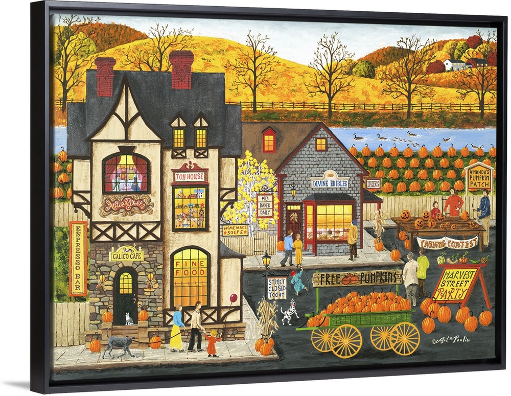 <p>Americana scene of a street full of shops with pumpkins and fall activities.</p>