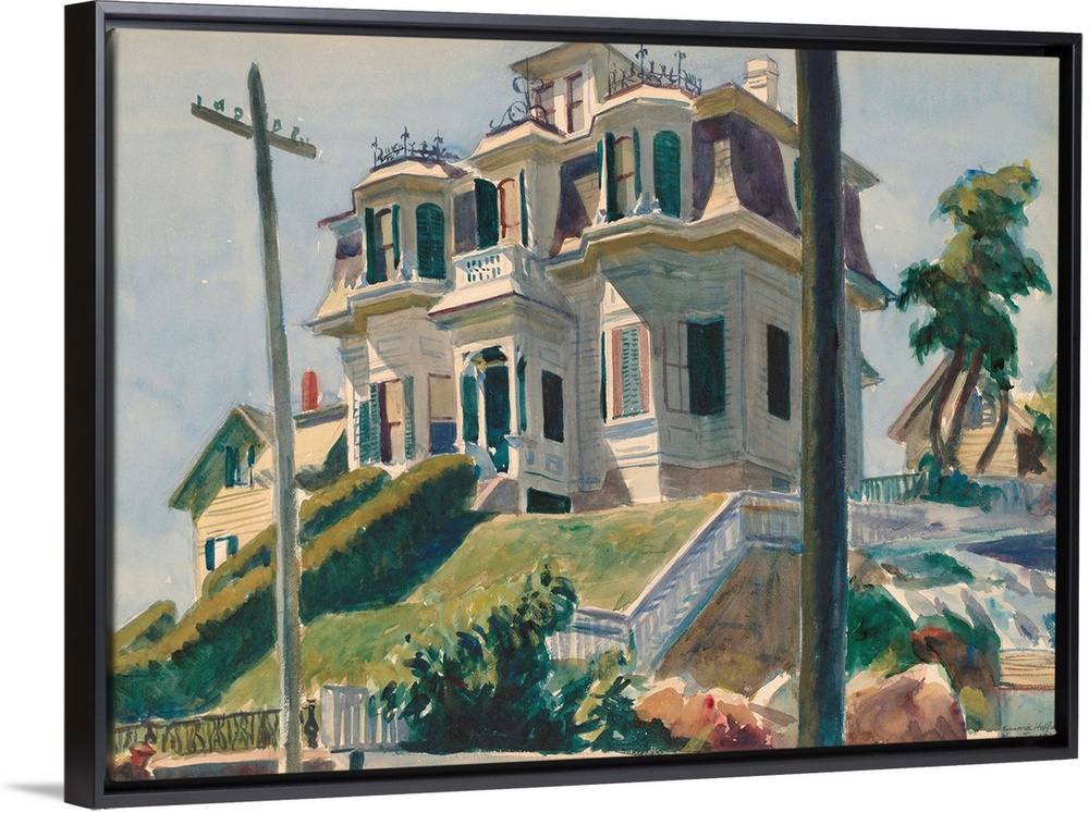 <p>Haskell's House, by Edward Hopper, 1924, American painting, watercolor over graphite drawing. Large, ornate Second Empire house set on a hill overlooking Gloucester harbor in Massachusetts, with a mansard roof. Hopper painted it from a low point of view a</p>