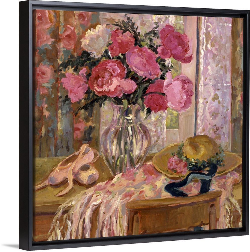 <p>Fine art oil painting still life of flowers, ballet slippers and a hat on a table in beautiful shades of pink and green by Allayn Stevens.</p>