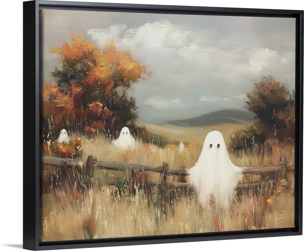 <p>A painting of a pasture with whimsical ghosts in the style of gothic horror.</p>